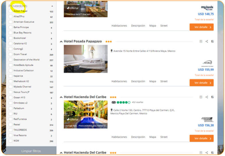 Dentro de cada Hotel segun el proveedor se puede ver: