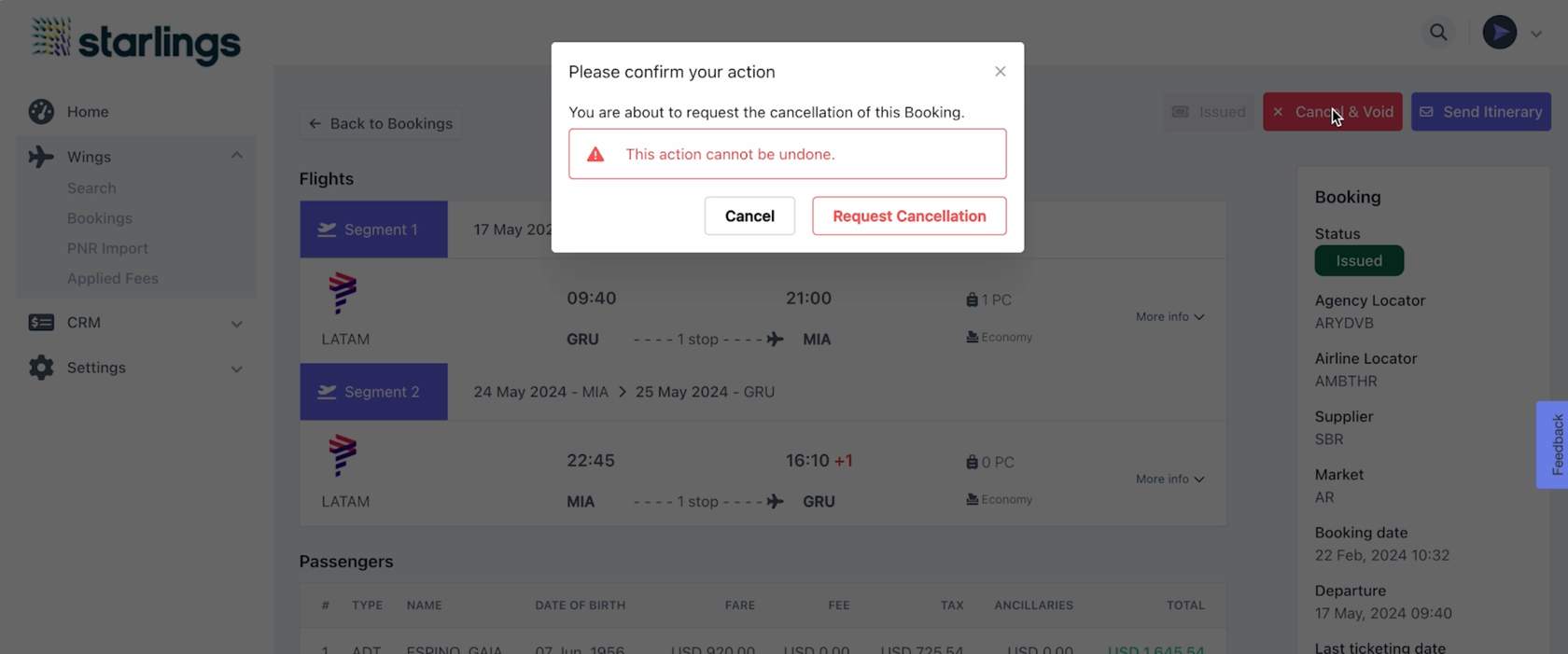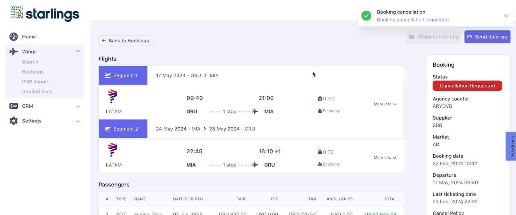 Cuando solicitamos que una reserva o ticket emitido sean cancelados, el estado pasa automáticamente a Cancellation Request. En 5 minutos, pasará a estado de Cancelado.